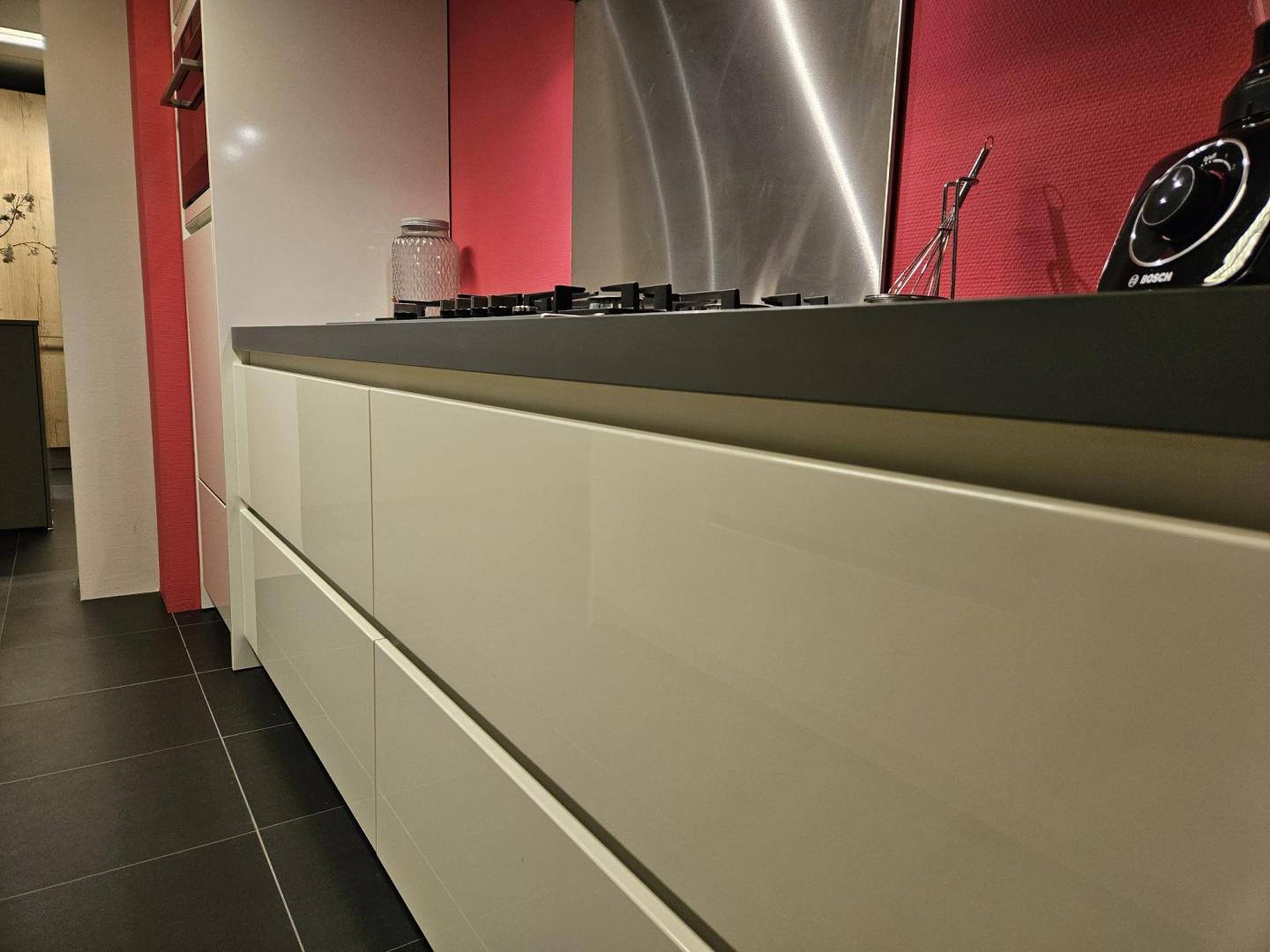 Moderne greeploze keuken met wit hoogglans gespoten deuren, Greenpanel aanrechtblad met 6 cm dikke rand.